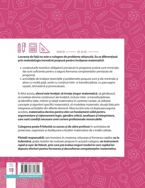 Lucrarea de față nu este o culegere de probleme obișnuită. Ea se diferențiază prin metodologia inovativă propusă pentru învățarea matematicii: