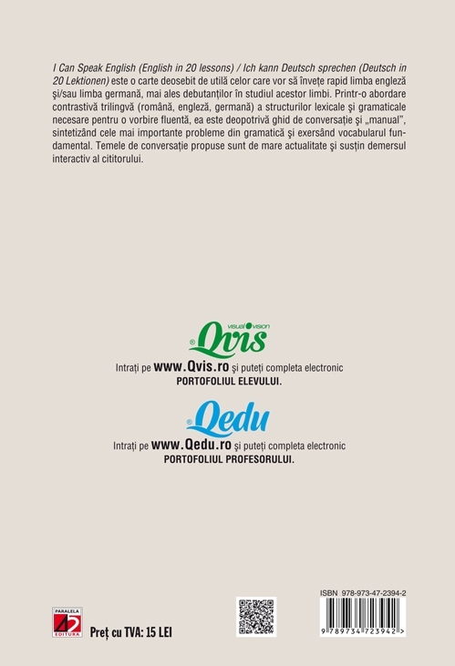 I Can Speak English (English in 20 lessons) / Ich kann Deutsche sprechen (Deutsch in 20 Lektionen) este o carte deosebit de utilă celor care vor să învețe rapid limba engleză și/sau limba germană, mai ales debutanților în studiul acestor limbi. Printr-o abordare contrastivă trilingvă (română, engleză, germană) a structurilor lexicale și gramaticale necesare pentru o vorbire fluentă, ea este deopotrivă ghid de conversație și `manual`, sintetizând cele mai importante probleme de gramatică și exersând vocabularul fundamental. Temele de conversație propuse sunt de mare actualitate și susțin demersul interactiv al cititorului.