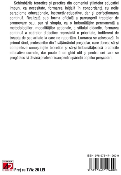 Schimbarile teoretice si practice din domeniul stiintelor educatiei impun, ca necesitate, formarea initiala in concordanta cu noile paradigme educationale, instructiv-educative, dar si perfectionarea continua. Realizata sub forma oficiala a parcurgerii treptelor de promovare, sau, pur si simplu, ca o imbunatatire permanenta a metodologiilor, modalitatilor actionale, a stilului didactic, formarea continua a cadrelor didactice reprezinta o prioritate, indiferent de treapta de scolaritate la care ne raportam. Lucrarea se adreseaza, in primul rand, profesorilor din invatamantul prescolar, care doresc sa-si completeze cunostintele teoretice si sa-si imbunatateasca practicile educative curente, dar poate fi un ghid util si pentru cei care se pregatesc sa devina profesori sau pentru parintii copiilor prescolari.