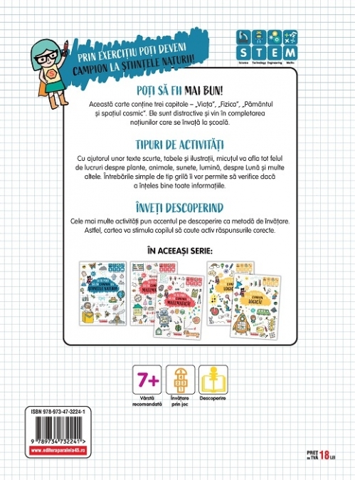PRIN EXERCIȚIU POȚI DEVENI campion la ȘTIINȚELE NATURII! Această carte conține trei capitole – „Viața”, „Fizica”, „Pământul și spațiul cosmic”. Ele sunt distractive și vin în completarea noțiunilor care se învață la școală.