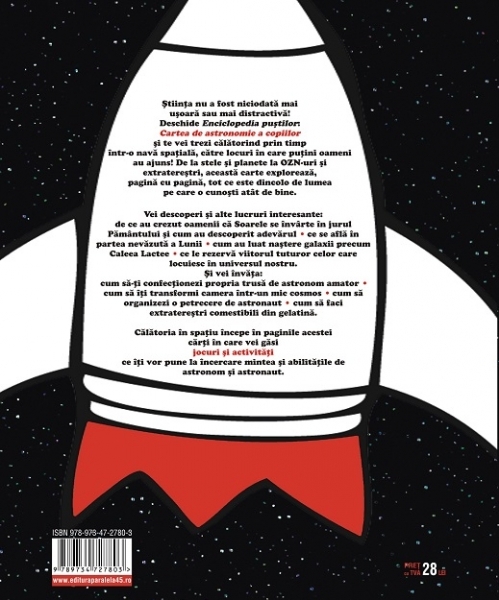 Vei descoperi și alte lucruri interesante: de ce au crezut oamenii că Soarele se învârte în jurul Pământului și cum au descoperit adevărul * ce se află în partea nevăzută a Lunii – cum au luat naștere galaxii precum Caleea Lactee * ce le rezervă viitorul tuturor celor care locuiesc în universul nostru. Și vei învăța: cum să-ți confecționezi propria trusă de astronom amator * cum să îți transformi camera într-un mic cosmos – cum să organizezi o petrecere de astronaut * cum să faci extratereștri comestibili din gelatină.