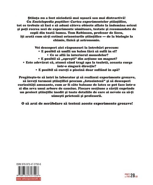 Cu Enciclopedia puștilor: Cartea experimentelor științifice, tot ce trebuie să faci e să aduni câteva obiecte aflate la îndemâna oricui și poți recrea zeci de experimente uimitoare, testate și recomandate de copii din toată lumea. Tom Robinson, profesor de liceu, îți arată cum să-ți extinzi orizonturile științifice – de la biologie la chimie, fizică și astronomie.