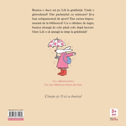 Bunica o duce azi pe Lili la grădiniţă. Unde e ghiozdanul? Dar pacheţelul cu mâncare? Şi-a luat echipamentul de sport? Dar cartea împrumutată de la bibliotecă? Cu o răbdare de înger, bunica aleargă de colo până colo după lucruri. Oare Lili o să ajungă la timp la grădiniţă?
