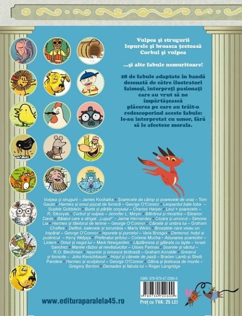 28 de fabule adaptate în bandă desenată de către ilustratori faimoși, interpreți pasionați care au vrut să ne împărtășească plăcerea pe care au trăit-o redescoperind aceste fabule: le-au interpretat cu umor, fără să le afecteze morala.