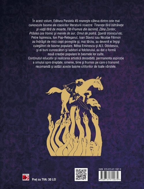 În acest volum, Editura Paralela 45 reuneşte câteva dintre cele mai cunoscute basme ale clasicilor literaturii noastre: Tinereţe fără bătrâneţe şi viaţă fără de moarte, Făt-Frumos din lacrimă, Zâna Zorilor, Prâslea cea Voinic şi merele de aur, Omul de piatră, Şperlă Voinicul etc.