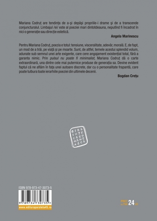 Pentru Mariana Codruț, poezia e totul: tensiune, visceralitate, adevăr, morală. E, de fapt, un mod de a trăi, pe viață și pe moarte. Sunt, de altfel, temele acestui splendid volum, adunate sub semnul unei arte exigente, care cere angajament existențial total, fără a garanta nimic. Prin pulsul nu poate fi minimalist, Mariana Codruț dă o carte extraordinară, una dintre cele mai puternice produse de generația sa. Devine evident faptul că ne aflăm în fața unei autoare discrete, dar cu o personalitate frapantă, care poate tulbura toate ierarhiile poeziei din ultimele decenii.