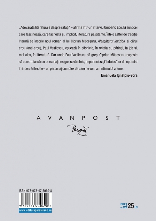 „Adevărata literatură e despre ratați” – afirma într-un interviu Umberto Eco. Ei sunt cei care fascinează, care fac viața și, implicit, literatura palpitante. Într-o astfel de tradiție literară se înscrie noul roman al lui Ciprian Măceșaru, Alergătorul invizibil, al cărui erou (anti-erou), Paul Vasilescu, eșuează în căsnicie, în relația cu părinții, la job și, mai ales, în literatură. Dar unde Paul Vasilescu dă greș, Ciprian Măceșaru reușește să construiască un personaj nesigur, șovăielnic, neputincios și înduioșător de optimist în încercările sale – un personaj complex de care ne vom aminti multă vreme.