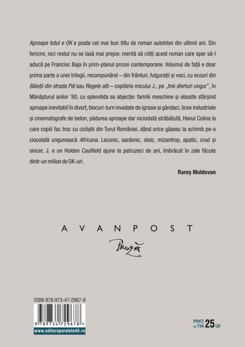 Aproape totul e OK e poate cel mai bun titlu de roman autohton din ultimii ani. Din fericire, nici restul nu se lasă mai prejos: merită să citiți acest roman care sper să-l aducă pe Francisc Baja în prim-planul prozei contemporane. Volumul de față e doar prima parte a unei trilogii, recompunând – din frânturi, fulgurații și voci, cu ecouri din Băieții din strada Pál sau Regele alb – copilăria micului J., pe „trei sferturi ungur”, în Mănășturul anilor ’80, cu splendida sa abjecție: familii meschine și obosite sfârșind aproape inevitabil în divorț, blocuri-turn invadate de igrasie și gândaci, licee industriale și cinematografe de beton, pădurea aproape dar niciodată străbătută, Hanul Colina la care copiii fac troc cu cicliștii din Turul României, dând orice găsesc la schimb pe-o ciocolată ungurească Africana. Laconic, sardonic, stoic, mizantrop, apatic, crud și sincer, J. e un Holden Caulfield ajuns la patruzeci de ani, îmbrăcat în zale făcute dintr-un milion de OK-uri.