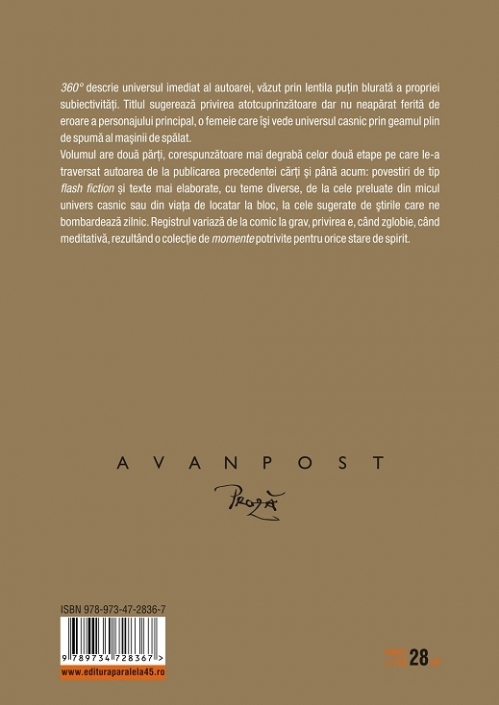 360° descrie universul imediat al autoarei, văzut prin lentila puţin blurată a propriei subiectivităţi. Titlul sugerează privirea atotcuprinzătoare dar nu neapărat ferită de eroare a personajului principal, o femeie care îşi vede universul casnic prin geamul plin de spumă al maşinii de spălat.