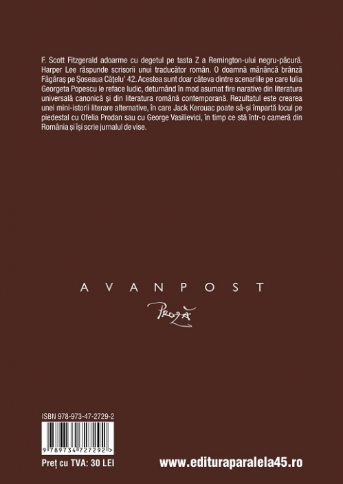 Scott Fitzgerald adoarme cu degetul pe tasta Z a Remington-ului negru-păcură. Harper Lee răspunde scrisorii unui traducător român. O doamnă mănâncă brânză Făgăraș pe Șoseaua Cățelu’ 42. Acestea sunt doar câteva dintre scenariile pe care Iulia Georgeta Popescu le reface ludic, deturnând în mod asumat fire narative din literatura universală canonică și din literatura română contemporană. Rezultatul este crearea unei mini-istorii literare alternative, în care Jack Kerouac poate să-și împartă locul pe piedestal cu Ofelia Prodan sau cu George Vasilievici, în timp ce stă într-o cameră din România și își scrie jurnalul de vise.
