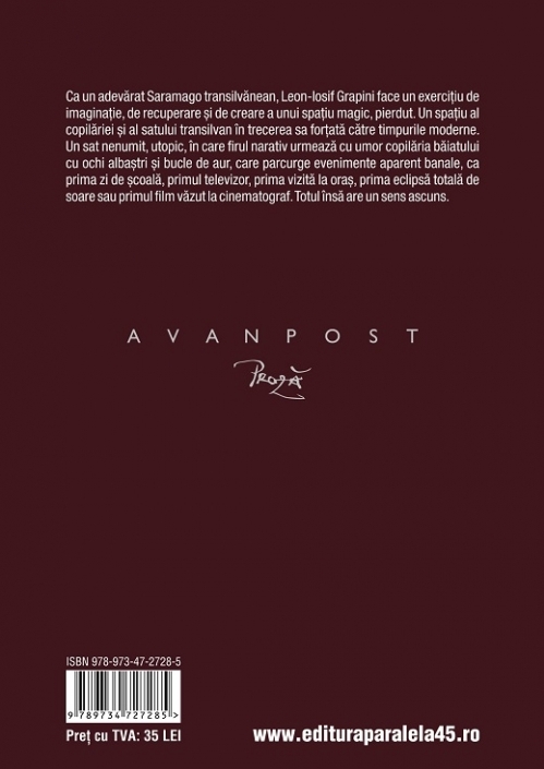 Ca un adevărat Saramago transilvănean, Leon-Iosif Grapini face un exercițiu de imaginație, de recuperare și de creare a unui spațiu magic, pierdut. Un spațiu al copilăriei și al satului transilvan în trecerea sa forțată către timpurile moderne. Un sat nenumit, utopic, în care firul narativ urmează cu umor copilăria băiatului cu ochi albaștri și bucle de aur, care parcurge evenimente aparent banale, ca prima zi de școală, primul televizor, prima vizită la oraș, prima eclipsă totală de soare sau primul film văzut la cinematograf. Totul însă are un sens ascuns.