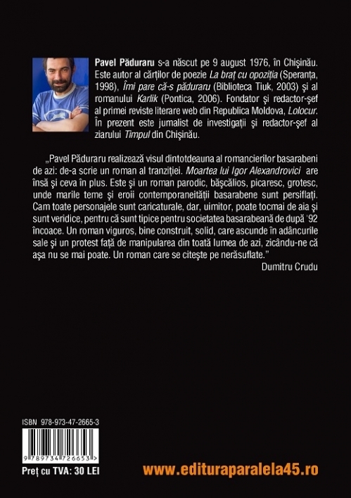 „Pavel Păduraru realizează visul dintotdeauna al romancierilor basarabeni de azi: de-a scrie un roman al tranziţiei. Moartea lui Igor Alexandrovici are însă şi ceva în plus. Este şi un roman parodic, băşcălios, picaresc, grotesc, unde marile teme şi eroii contemporaneităţii basarabene sunt persiflaţi. Cam toate personajele sunt caricaturale, dar, uimitor, poate tocmai de aia şi sunt veridice, pentru că sunt tipice pentru societatea basarabeană de după ’92 încoace. Un roman viguros, bine construit, solid, care ascunde în adâncurile sale şi un protest faţă de manipularea din toată lumea de azi, zicându-ne că aşa nu se mai poate. Un roman care se citeşte pe nerăsuflate.”