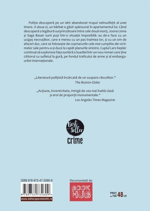 Poliția descoperă pe un iaht abandonat trupul neînsuflețit al unei tinere. A doua zi, un bărbat e găsit spânzurat în apartamentul lui. Când descoperă o legătură surprinzătoare între cele două morți, Joona Linna și Saga Bauer sunt puși într-o situație imposibilă: au de-a face cu un ucigaș necruțător, care e mereu cu un pas înaintea lor, și cu un om de afaceri dur, care se folosește de coșmarurile cele mai cumplite ale victimelor sale pentru a-și duce la capăt planurile sinistre. Cuplul Lars Kepler continuă să exploreze fața sumbră a Suediei într-un nou thriller care ține cititorul cu sufletul la gură, pe fondul traficului de arme și al embargourilor internaționale.