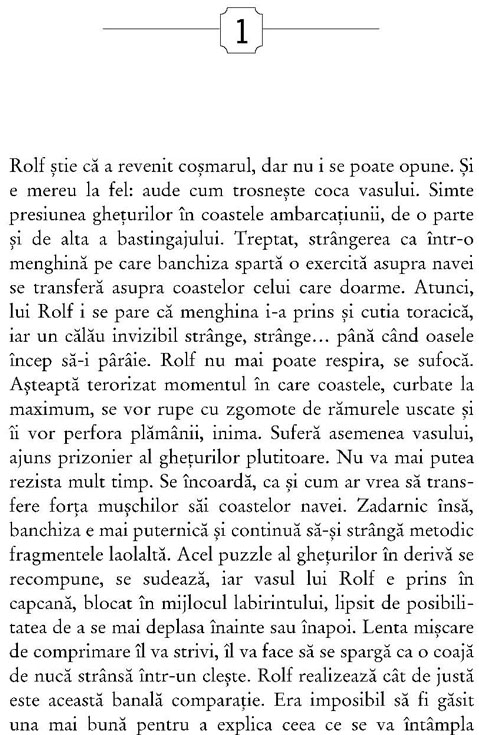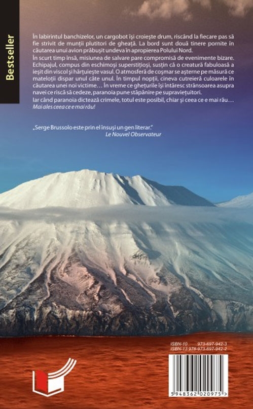 Deschizand aceasta carte, cititorul este socat, ca de fiecare data, de mecanica diabolica a naratiunii lui Serge Brussolo. Romanul e plin de peripetii si capcane proprii genului thriller, dar nu e vorba doar de un thriller, ci si de o incursiune in psihicul uman. Autorul urmareste evolutia personajelor care ajung pe nesimtite la limita nebuniei, intr-un spatiu de refugiu, un spatiu de aparare contra realitatii. La inceput, personajele se afla intr-o situatie greu suportabila si fara speranta. Se straduiesc sa faca ceva si reusesc sa scape de situatia atroce initiala, dupa ce trec prin nenumarate incercari. Spre sfarsitul cartii, se profileaza o situatie diferita, dar la fel de greu de suportat si tot fara speranta. Aceasta conceptie ciclica de situatii este mai vizibila ca niciodata in Iceberg. Serge Brussolo a reusit sa urzeasca cu mare abilitate un roman in care analiza psihologica a personajelor se ia la intrecere cu suspansul. Intamplarile neasteptate se succed cu repeziciune, fara niciun moment de ragaz, cititorul ramanand cu respiratia taiata de admiratie, ici si colo, in fata unei imagini de-a dreptul splendide, aproape fantastice, precum cea a aisbergurilor tabulare care se topesc molcom in contact cu apele calde ale oceanului. Nimic mai greu pentru cititor decat sa lase cartea din mana inainte de ultima pagina!