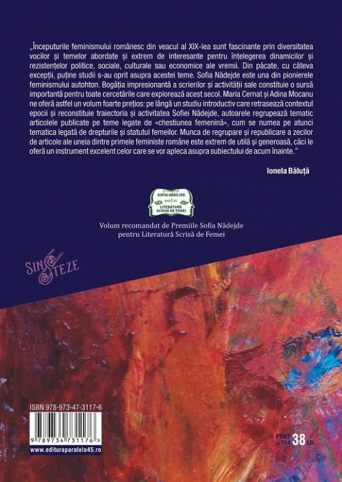 „Începuturile feminismului românesc din veacul al XIX-lea sunt fascinante prin diversitatea vocilor și temelor abordate și extrem de interesante pentru înțelegerea dinamicilor și rezistențelor politice, sociale, culturale sau economice ale vremii. Din păcate, cu câteva excepții, puține studii s-au oprit asupra acestei teme. Sofia Nădejde este una din pionierele feminismului autohton. Bogăția impresionantă a scrierilor și activității sale constituie o sursă importantă pentru toate cercetările care explorează acest secol. Maria Cernat și Adina Mocanu ne oferă astfel un volum foarte prețios: pe lângă un studiu introductiv care retrasează contextul epocii și reconstituie traiectoria și activitatea Sofiei Nădejde, autoarele regrupează tematic articolele publicate pe teme legate de «chestiunea femenină», cum se numea pe atunci tematica legată de drepturile și statutul femeilor. Munca de regrupare și republicare a zecilor de articole ale uneia dintre primele feministe române este extrem de utilă și generoasă, căci le oferă un instrument excelent celor care se vor apleca asupra subiectului de acum înainte.”