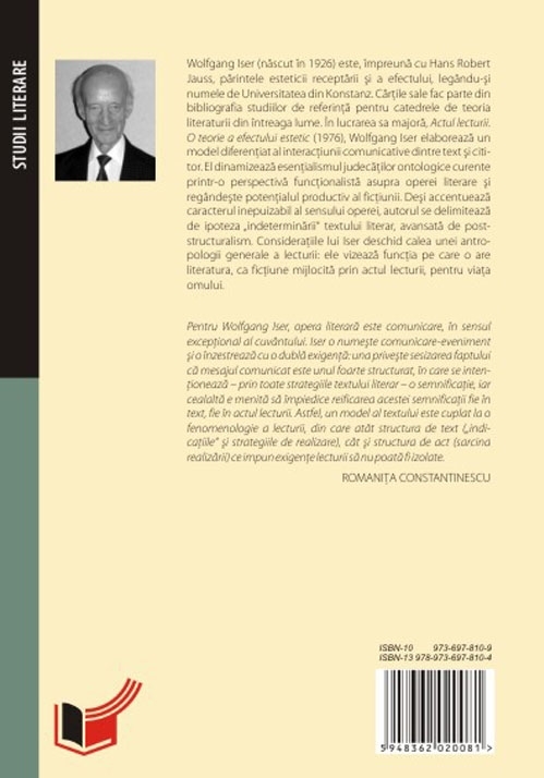 Coleg cu Hans Robert Jauss la Universitatea de la Constanz, Germania, Wolfgang Iser(n1926) e cunoscut pentru contributiile sale majore la fundamentarea unei teorii a receptarii literare. Influentat de fenomenologie si de studiile lui Husserl, Ingarden, Gadamer si Georges Poulet, teoreticianul german propune o hermeneutica a lecturii in care dialogul dintre cititor si text devine factorul esential in geneza semnificatiei operei. Autor al unor studii cu privire la opera lui Shakespeare, Lawrence Stern, Henry Fielding, Beckett, profesorul Iser si-a castigat notorietatea internationala prin volume ca Prospecting :From Reader Response to Literary Anthropology(1989) si The Range of Interpretation (2000). Publicata in 1976, marea sa sinteza teoretica intitulata Actul lecturii(Der Akt des Lesens) stabileste raporturile intre text si cititor si modurile in care acestea sunt modelate in interactiunea lor comunicativa. Spre deosebire de structuralism,autorul propune aici un model functionalist al textului literar.