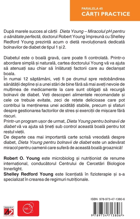 După marele succes al cărţii `Dieta Young, Miracolul pH pentru o sănătate perfectă`, doctorul Robert Young împreună cu Shelley Redford Young prezintă acum o dietă revoluţionară dedicată bolnavilor de diabet de tipul 1 şi 2. Diabetul este o boală gravă, care poate fi controlată. Printr-o abordare simplă şi naturală, cartea doctorului Young vă va ajuta să atenuaţi sau chiar să înlăturaţi factorii care au declanşat boala. În numai 12 săptămâni, veţi fi pe drumul spre redobândirea sănătaţii depline şi a unei stări de bine fără să mai aveţi nevoie de mulţimea de medicamente la care sunt obligaţi să recurgă bolnavii de diabet. Veţi descoperi alimentele recomandate şi cele ce trebuie evitate, zeci de reţete delicioase care pot contribui la menţinerea unei acidităţi stabile, precum şi sfaturi despre gestionarea factorilor de stres şi exerciţii de mişcare fără riscuri. Printr-un program uşor de urmat, `Dieta Young pentru bolnavii de diabet` vă va ajuta să ţineţi sub control această boală pentru tot restul vieţii. De departe cea mai importantă carte scrisă vreodată despre diabet, `Dieta Young pentru bolnavii de diabet` este un adevărat miracol pentru oamenii care suferă de această boală groaznică! Robert O. Young este microbiolog şi nutriţionist de renume internaţional, conducătorul Centrului de Cercetări Biologice Innerlight. Shelley Redford Young este licenţiată în fizioterapie şi s-a specializat în crearea de regimuri nutriţionale.