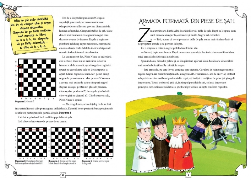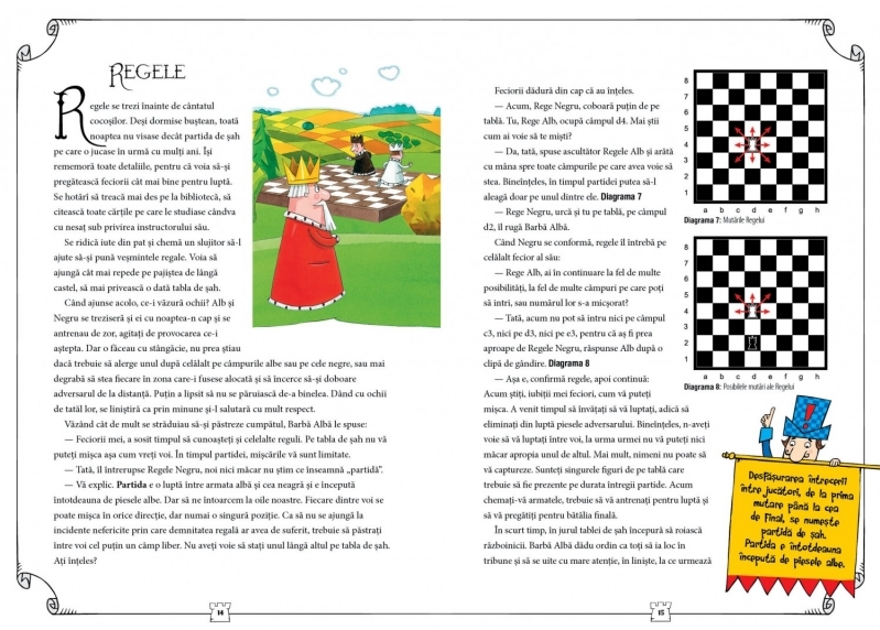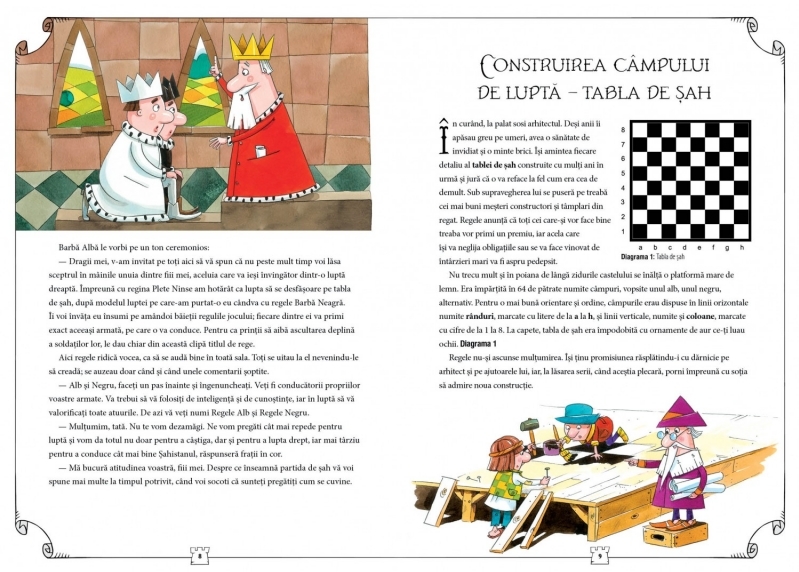 O poveste despre un rege și fiii săi între care vrea să împartă regatul, iar fiii își dovedesc valoarea într-un meci de șah. Autorii introduc cititorul treptat la mișcările admise ale pieselor, discută regulile. Toate aceste lucruri sunt descrise într-un mod clar și pe înțelesul copiilor.