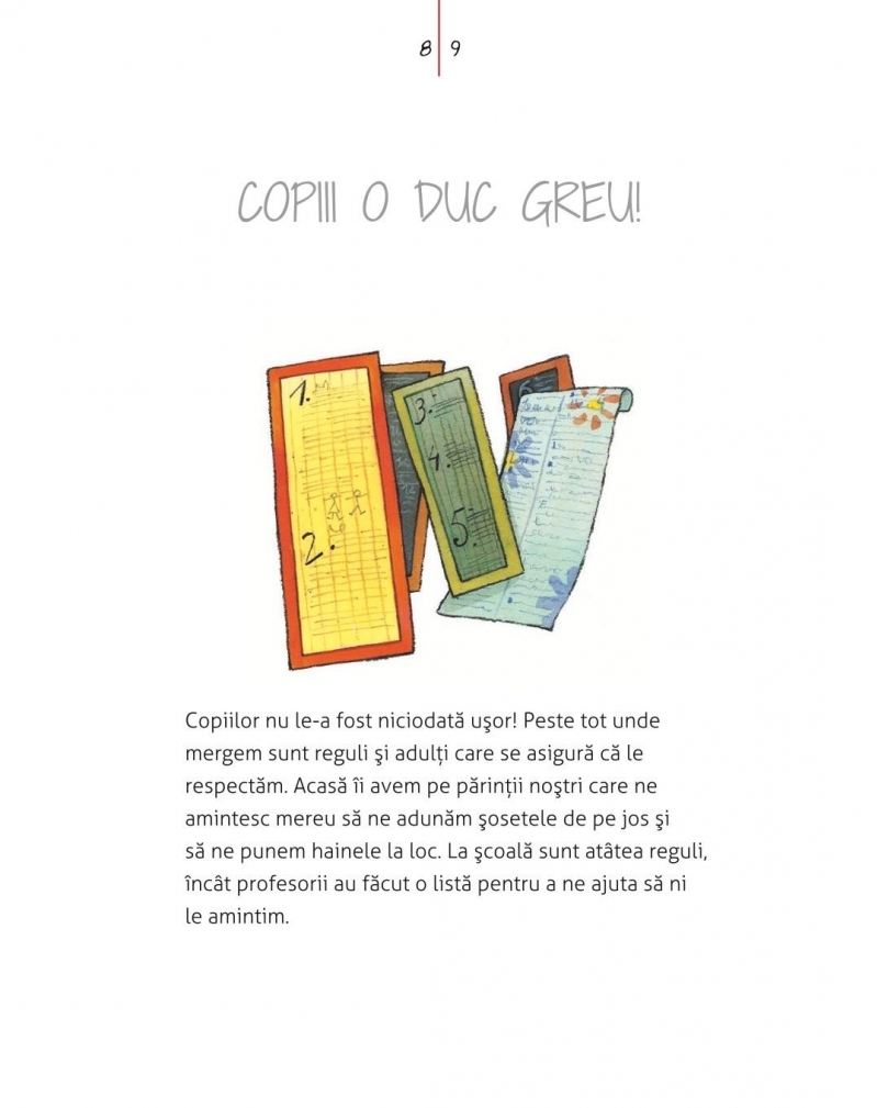 Scopul acestei cărţi este acela de a face cunoscute, din perspectiva unui copil, câteva dintre realităţile vieţii acestuia. A fi copil poate fi uneori dificil, mai ales atunci când sunt atâtea lucruri care par nedrepte. Sunt reguli, consecinţe şi adulţi peste tot!