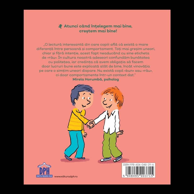 O lectură interesantă din care copiii află că există o mare diferență între persoană și comportament. Toți mai greșim uneori, chiar și fără intenție, acest fapt neaducând cu sine eticheta de “rău”. Nimeni nu este complet rău sau drăguț, dar oricine poate să facă rău sau să spună lucruri fără să-și dea seama, depinde de moment.
