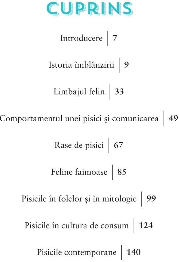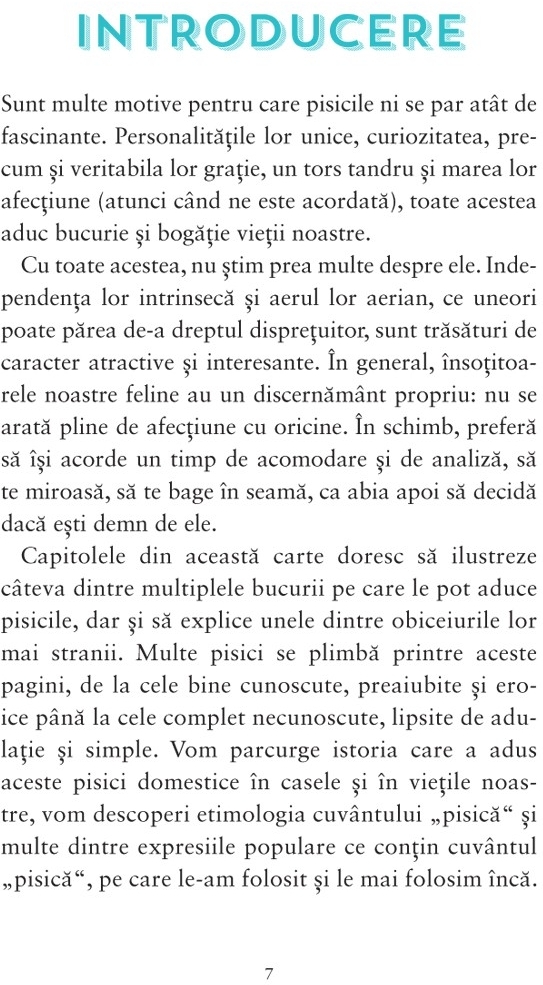 În momentele liniștite pe care le veți petrece citind această minunată carte, veți zâmbi amuzați de poveștile încântătoare despre aceste feline calde, iar citatele minunat alese vă vor confirma, dacă mai era nevoie, că momentul în care ați decis să creșteți o pisică a fost cea mai bună alegere. Atât pentru confortul ei, cât și pentru sufletul dumneavoastră.