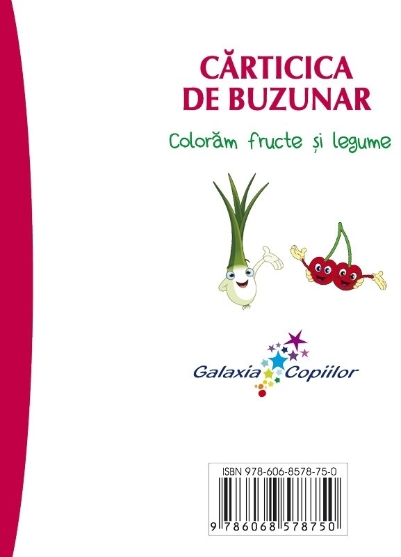 Cărticica de buzunar pătrată este ideală pentru mânuțele copiilor și numai bună de strecurat în geantă când plecăm la plimbare. Indiferent unde se deschide, din cărticică apar fructe zâmbitoare și legume drăgălașe dornice să prindă culoare. Copiii vor fi încântați de întâlnirea cu vânăta care poartă papion, ceapa cu mănuși galbene, morcovul care își admiră machiajul în oglindă, cireșele îmbrățișate, ciupercuța entuziastă și multe alte fructe și legume.