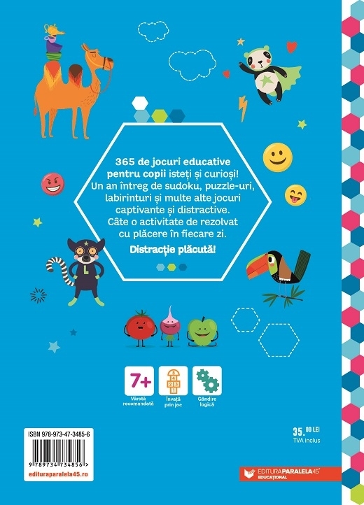 365 de jocuri educative pentru copii isteți și curioși! Un an întreg de sudoku, puzzle-uri, labirinturi și multe alte jocuri captivante și distractive. Câte o activitate de rezolvat cu plăcere în fiecare zi. Distracție plăcută!