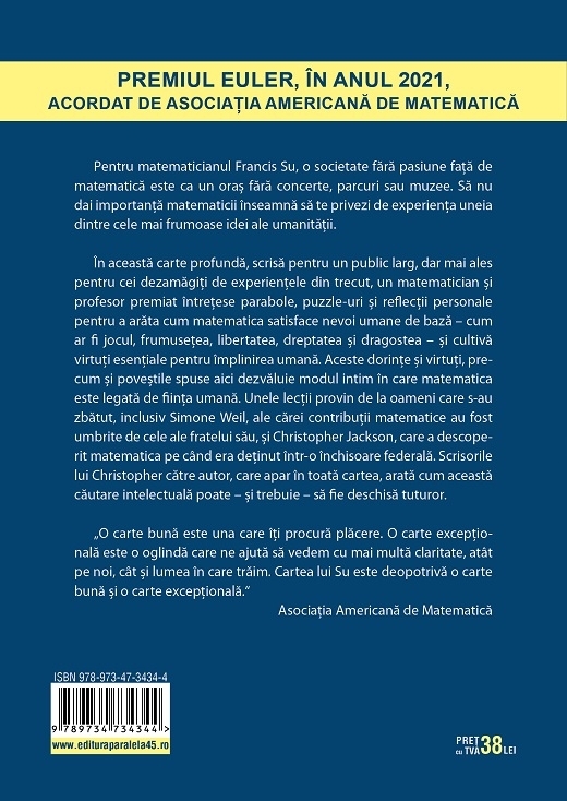 În această carte profundă, scrisă pentru un public larg, dar mai ales pentru cei dezamăgiți de experiențele din trecut, un matematician și profesor premiat întrețese parabole, puzzle-uri și reflecții personale pentru a arăta cum matematica satisface nevoi umane de bază – cum ar fi jocul, frumusețea, libertatea, dreptatea și dragostea – și cultivă virtuți esențiale pentru împlinirea umană. Aceste dorințe și virtuți, precum și poveștile spuse aici dezvăluie modul intim în care matematica este legată de ființa umană. Unele lecții provin de la oameni care s-au zbătut, inclusiv Simone Weil, ale cărei contribuții matematice au fost umbrite de cele ale fratelui său, și Christopher Jackson, care a descoperit matematica pe când era deținut într-o închisoare federală. Scrisorile lui Christopher către autor, care apar în toată cartea, arată cum această căutare intelectuală poate – și trebuie – să fie deschisă tuturor.