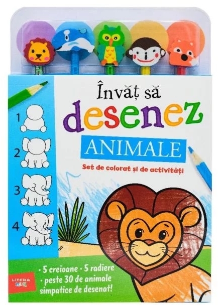 Instrucțiunile pas cu pas, planșele pentru exersat și fundalurile distractive, concepute special pentru ei, îi ajută pe copii să creeze cu ușurință propriile lor opere de artă! Animalele care pozează pentru micii artiști sunt felurite: lei, urși, zebre, păianjeni... și vin împreună cu cinci creioane colorate.