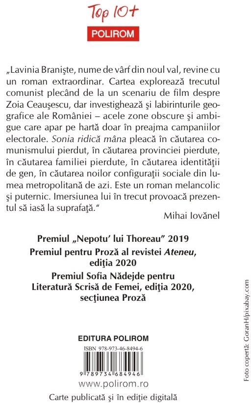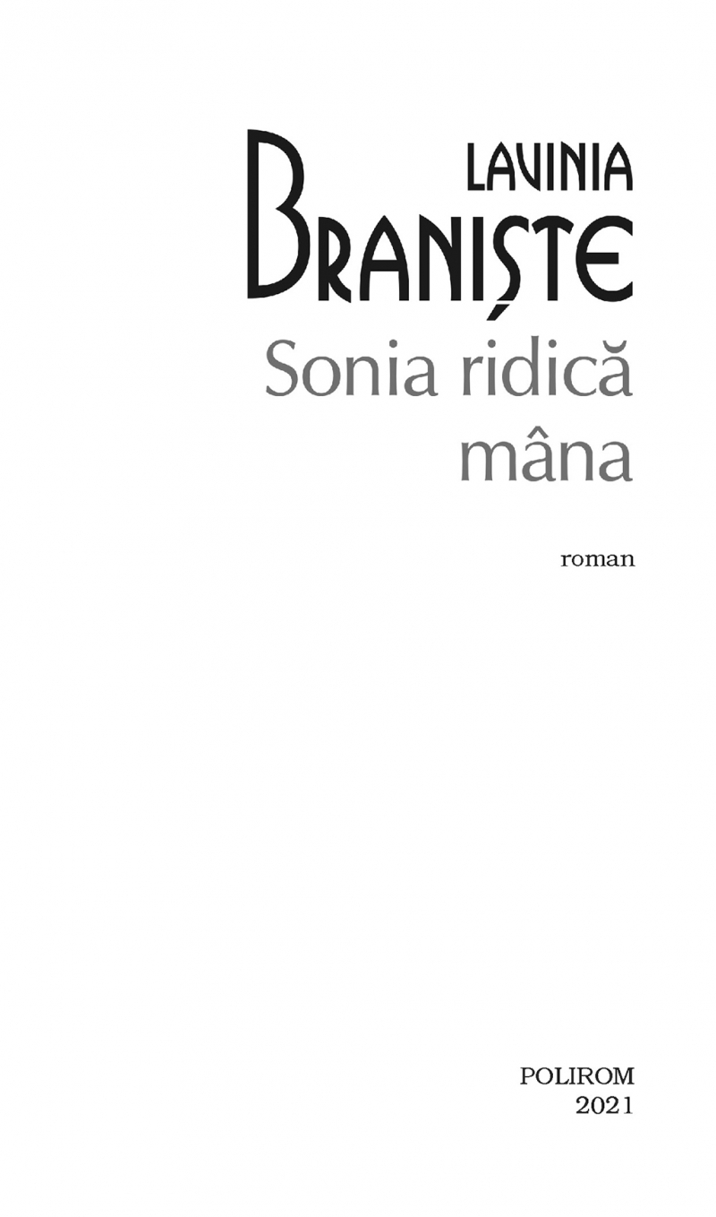 „Lavinia Branişte, nume de vîrf din noul val, revine cu un roman extraordinar. Cartea explorează trecutul comunist plecînd de la un scenariu de film despre Zoia Ceauşescu, dar investighează şi labirinturile geografice ale României – acele zone obscure şi ambigue care apar pe hartă doar în preajma campaniilor electorale. Sonia ridică mâna pleacă în căutarea comunismului pierdut, în căutarea provinciei pierdute, în căutarea familiei pierdute, în căutarea identităţii de gen, în căutarea noilor configuraţii sociale din lumea metropolitană de azi. Este un roman melancolic şi puternic. Imersiunea lui în trecut provoacă prezentul să iasă la suprafaţă.” (Mihai Iovănel)