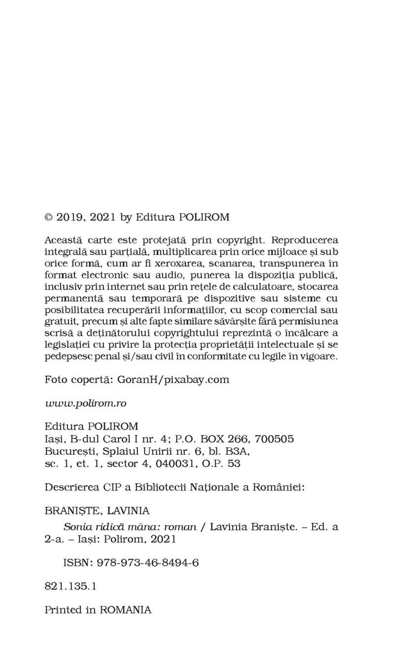 Comandă online cartea "Sonia ridică mâna (ediție de buzunar)" la 31,35 lei isbn 9789734684946 scrisă de Lavinia Braniste, tiparită la editura Polirom face parte din colecția Top 10+. cu plata ramburs sau online cu cardul. Momentan titlul "Sonia ridică mâna (ediție de buzunar)" nu este disponibil însa vă puteți înscrie pentru a fi notificat în momenul reaprovizionarii.