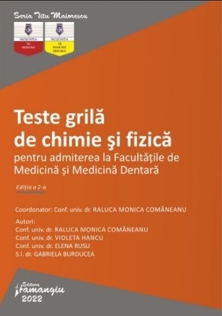 Prezenta lucrare contine teste grila orientative pentru verificarea cunostintelor candidatilor la concursul de admitere la specializarea Medicina a Facultatii de Medicina, respectiv Medicina Dentara a Facultatii de Medicina Dentara din cadrul Universitatii Titu Maiorescu din Bucuresti. Grilele au fost realizate cu 1‐2 variante corecte de raspuns, conform disciplinelor de concurs „Chimie” si „Fizica”.