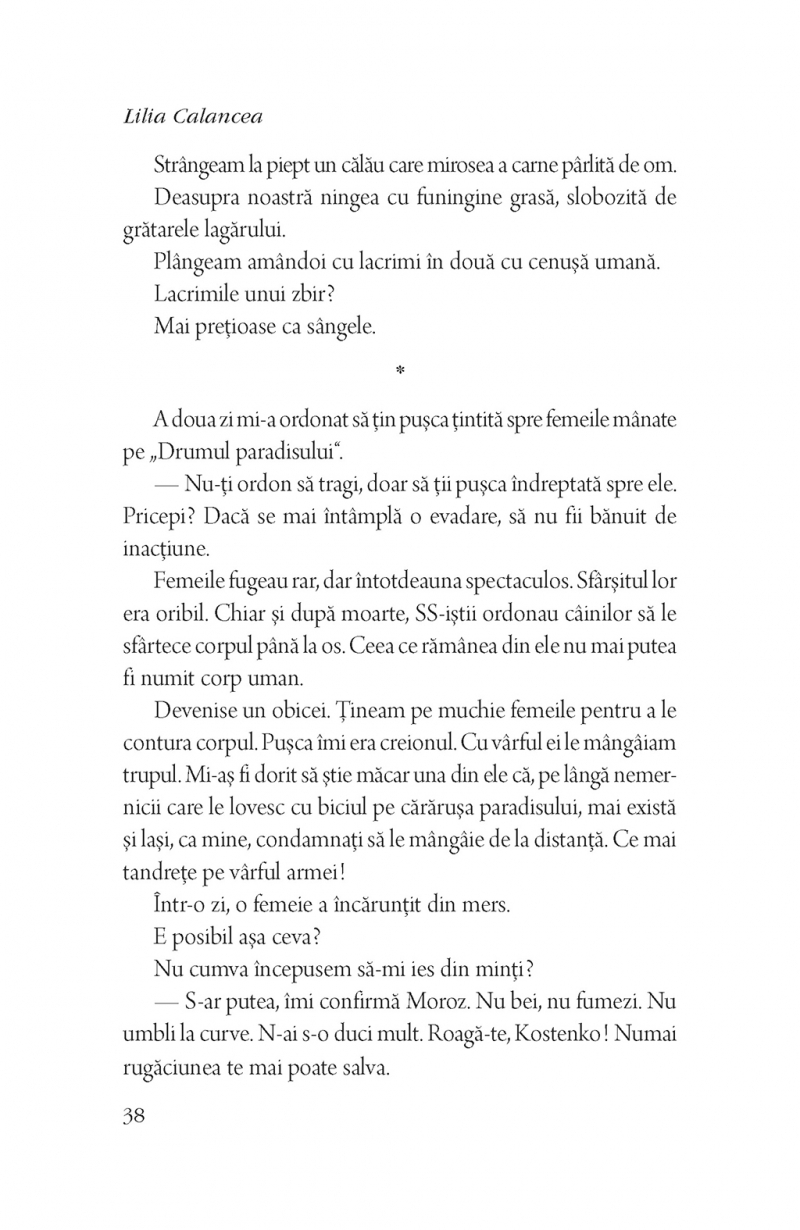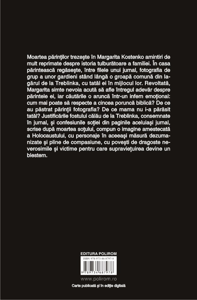 Moartea părinților trezește în Margarita Kostenko amintiri de mult reprimate despre istoria tulburătoare a familiei. În casa părintească regăsește, între filele unui jurnal, fotografia de grup a unor gardieni stând lângă o groapă comună din lagărul de la Treblinka, cu tatăl ei în mijlocul lor. Revoltată, Margarita simte nevoia acută să afle întregul adevăr despre părintele ei, iar căutările o aruncă într-un infern emoțional: cum mai poate să respecte a cincea poruncă biblică? De ce au păstrat părinții fotografia? De ce mama nu i-a părăsit tatăl? Justificările fostului călău de la Treblinka, consemnate în jurnal, și confesiunile soției din paginile aceluiași jurnal, scrise după moartea soțului, compun o imagine amestecată a Holocaustului, cu personaje în aceeași măsură dezumanizate și pline de compasiune, cu povești de dragoste neverosimile și victime pentru care supraviețuirea devine un blestem.