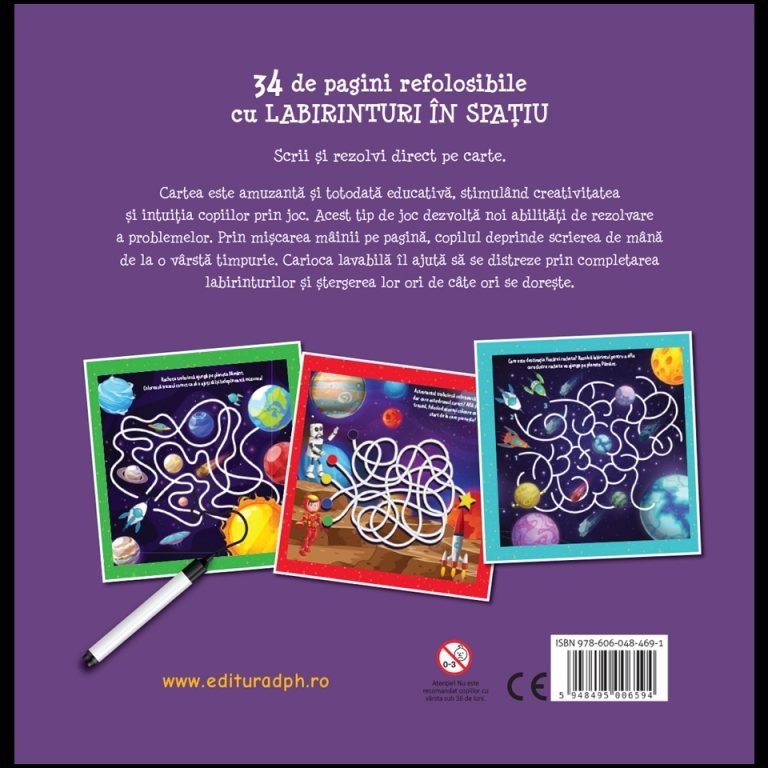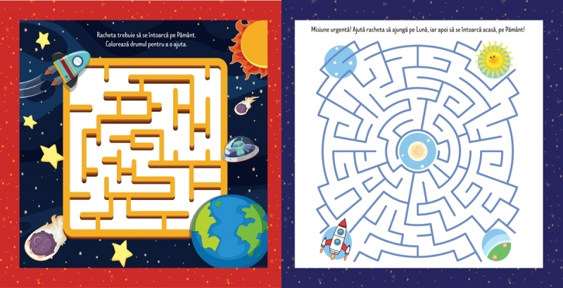 Această carte cuprinde 34 de pagini refolosibile cu labirinturi în spațiu.