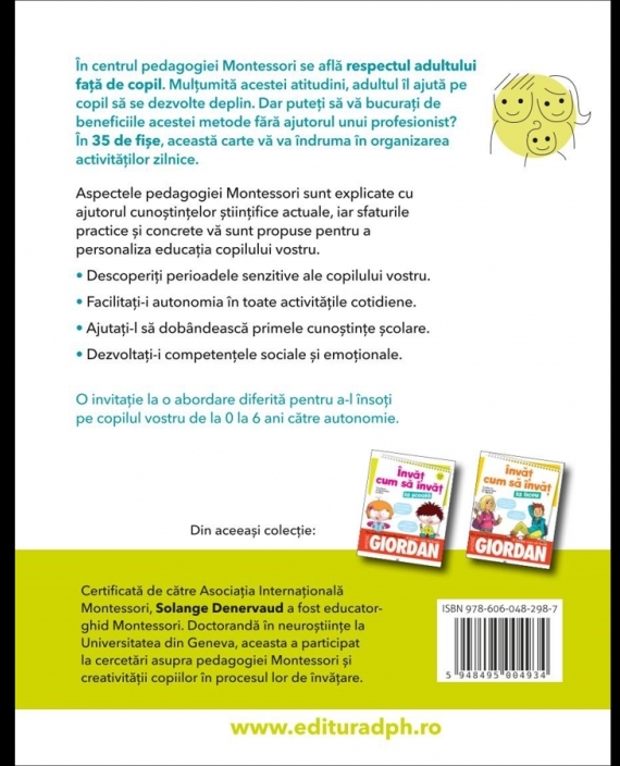 Fișele din această carte vă arată cum conceptele de bază transmise de Maria Montessori pot fi puse în practică în viața de zi cu zi, acasă, împreună cu cei mici, pentru a favoriza armonia în familie. Aceste fișe vă explică și cum funcționează mecanismele cerebrale și de ce ideile Mariei Montessori funcționează atât de bine.