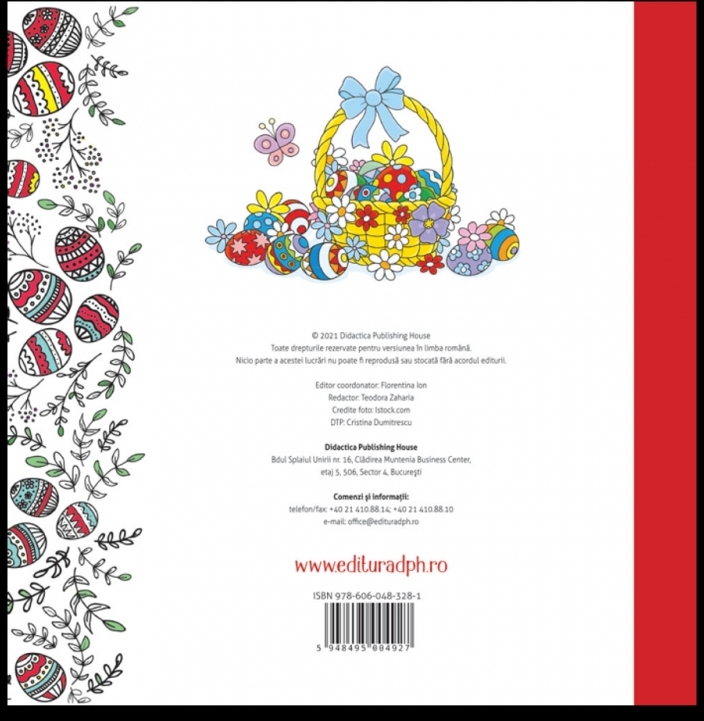 Comandă online cartea "Paste fericit! - Carte de colorat" la 14,80 lei isbn 9786060483281, tiparită la editura Didactica Publishing House nefolosita (noua) categorie Carți nou apărute, Carte nefolosită. Cartea poate fi livrată în circa 2 zile cu plata ramburs sau online cu cardul.