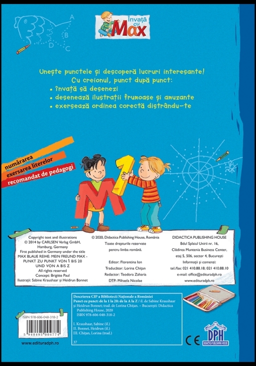 Comandă online cartea "Invata cu Max - Punct cu punct - De la 1 la 20, de la A LA Z" la 14,80 lei isbn 9786060483182, tiparită la editura Didactica Publishing House nefolosita (noua) categorie Carți nou apărute, Carte nefolosită. Cartea poate fi livrată în circa 2 zile cu plata ramburs sau online cu cardul.