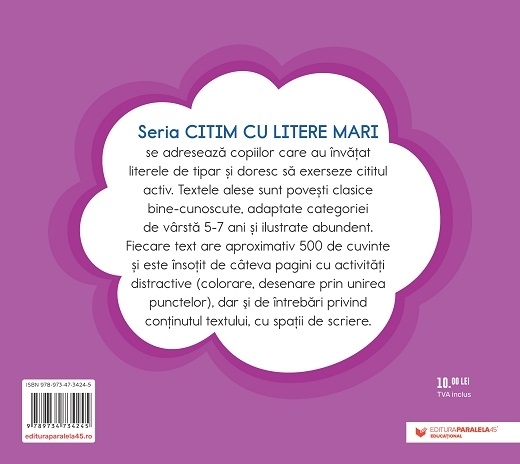 Seria Citim cu litere mari se adresează copiilor care au învățat literele de tipar și doresc să exerseze cititul activ. textele alese sunt povești clasice bine-cunoscute, adaptate categoriei de vârstă 5-7 ani și ilustrate abundent. Fiecare text are aproximativ 500 de cuvinte și este însoțit de câteva pagini cu activități distractive (colorare, desenare prin unirea punctelor), dar şi de întrebări privind conținutul textului, cu spații de scriere.