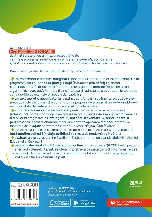 Seria de lucrări MATE 2000+ CONSOLIDARE, destinată claselor de gimnaziu, respectă toate cerințele programei referitoare la competențe generale, competențe specifice și conținuturi, oferind sugestii metodologice dintre cele mai atractive.