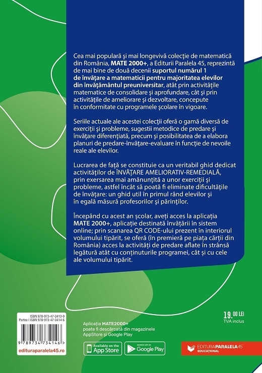 Cea mai populară şi mai longevivă colecţie de matematică din România, MATE 2000+, a Editurii Paralela 45, reprezintă de mai bine de două decenii suportul numărul 1 de învăţare a matematicii pentru majoritatea elevilor din învăţământul preuniversitar, atât prin activităţile matematice de consolidare şi aprofundare, cât şi prin activităţile de ameliorare şi dezvoltare, concepute în conformitate cu programele şcolare în vigoare.