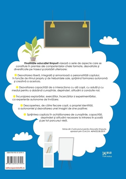 Scanând codul QR din interiorul auxiliarului veți putea descărca gratuit fișe de lucru suplimentare și cu activități recuperatorii pentru grupa de vârsta 5-6 ani. Fișele conțin exerciții variate (labirint, colorare, încercuire, asociere etc.), sunt colorate și atractiv ilustrate.