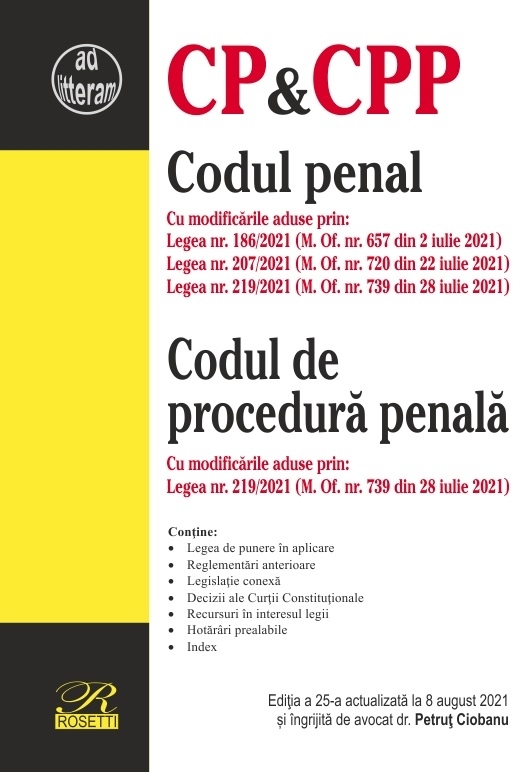 Comandă online cartea "Codul penal si Codul de procedura penala. Editia a 25-a actualizata la 8 august 2021" la 39,10 lei isbn 9786060250654 scrisă de Petrut Ciobanu, tiparită la editura Rosetti în anul 2021. Cartea poate fi livrată în circa 2 zile cu plata ramburs sau online cu cardul.
