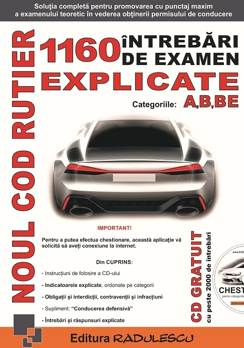 Comandă online cartea "Noul cod rutier. 1160 intrebari de examen explicate. Categoriile A, B, BE. Editia 2021 (contine CD)" la 63,91 lei isbn 9786069495025, tiparită la editura Radulescu în anul 2021 categorie Drept, Carte nefolosită, Dreptul transporturilor. cu plata ramburs sau online cu cardul. Momentan titlul "Noul cod rutier. 1160 intrebari de examen explicate. Categoriile A, B, BE. Editia 2021 (contine CD)" nu este disponibil însa vă puteți înscrie pentru a fi notificat în momenul reaprovizionarii.