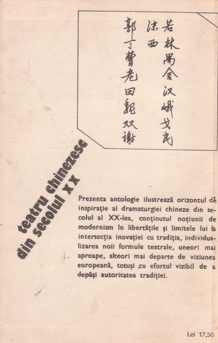 Comandă online cartea "Teatru chinezesc din secolul XX" la 15,90 lei Constantin Lupeanu în anul 1981 cu un număr de 440 pagini categorie Teatru, Beletristică și critică. cu plata ramburs sau online cu cardul. Momentan titlul "Teatru chinezesc din secolul XX" nu este disponibil însa vă puteți înscrie pentru a fi notificat în momenul reaprovizionarii.