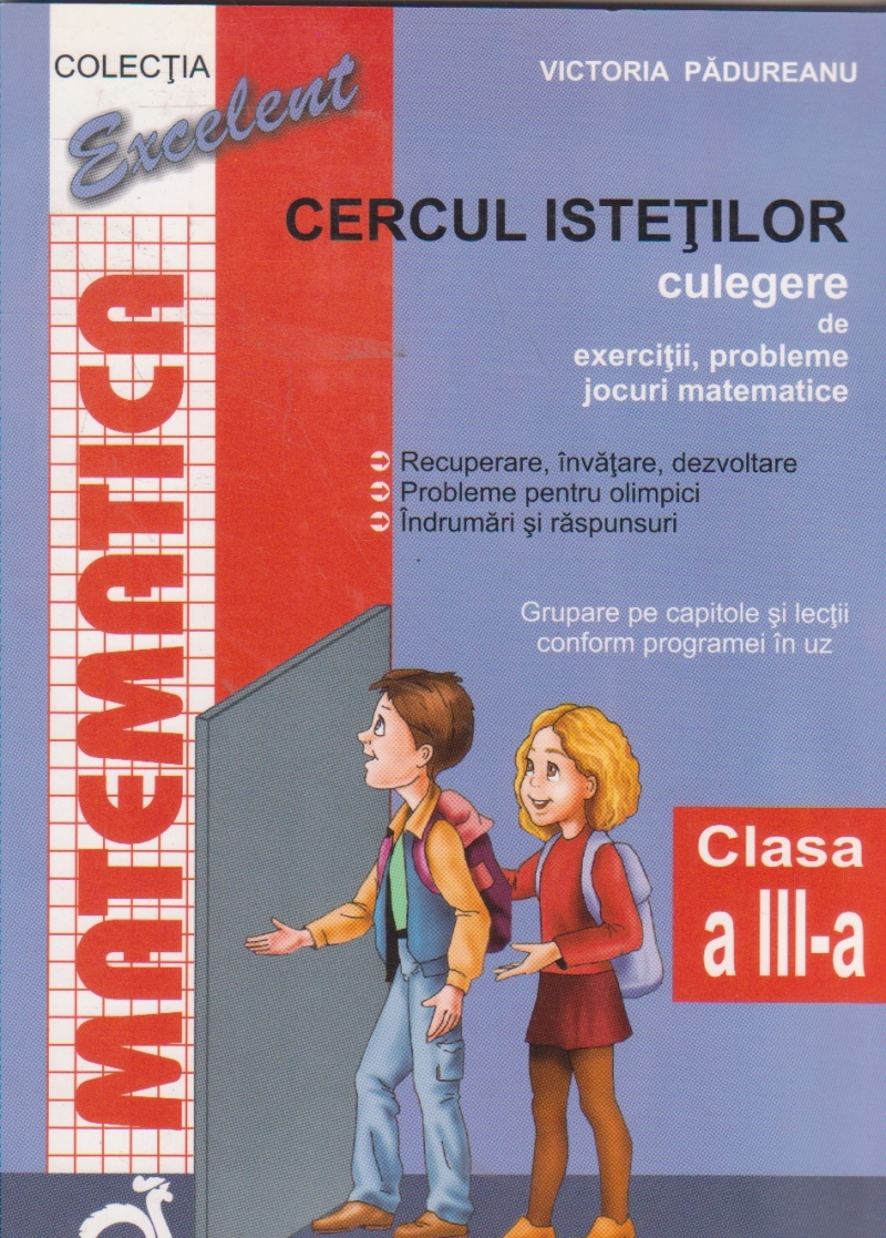 Comandă online cartea "Matematica. Cercul istetilor. Culegere de exercitii, probleme, jocuri matematice, Clasa a III-a" la 10,50 lei scrisă de VICTORIA PADUREANU, tiparită la editura Vox în anul 2007 cu un număr de 192 pagini. cu plata ramburs sau online cu cardul. Momentan titlul "Matematica. Cercul istetilor. Culegere de exercitii, probleme, jocuri matematice, Clasa a III-a" nu este disponibil însa vă puteți înscrie pentru a fi notificat în momenul reaprovizionarii.