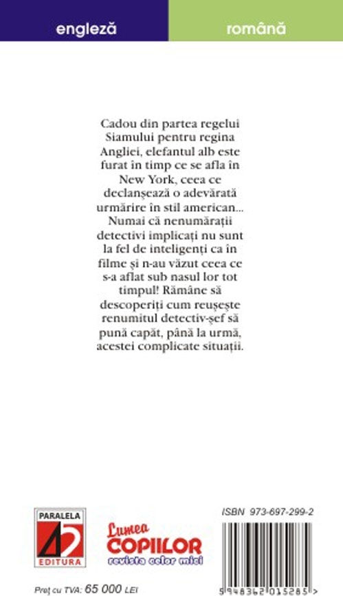 Cadou din partea regelui Siamului pentru regina Angliei,elefantul alb este furat in timp ce se afla in New York, ceea ce declanseaza o adevarata urmarire in stil american. Numai ca nenumaratii detectivi implicati nu sunt la fel de inteligenti ca in filme si n-au vazut ceea ce s-a aflat sub nasul lor tot timpul. Ramane sa descoperiti cum reuseste renumitul detectiv-sef sa puna capat, pana la urma, acestei complicate situatii si n-o sa va vina sa credeti cine il ajuta.