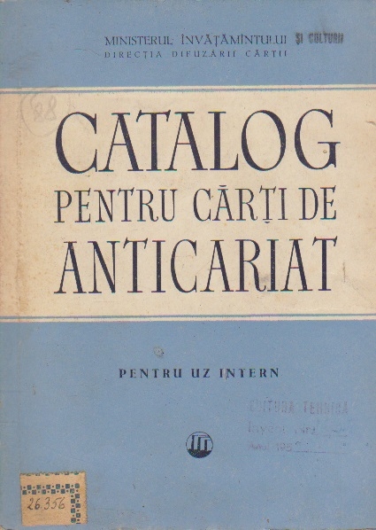 Comandă online cartea "Catalog Pentru Carti de Anticariat. Pentru uz intern" la 26,40 lei scrisă de Ministerul Culturii, tiparită la editura Tehnica în anul 1957 cu un număr de 312 pagini. cu plata ramburs sau online cu cardul. Momentan titlul "Catalog Pentru Carti de Anticariat. Pentru uz intern" nu este disponibil însa vă puteți înscrie pentru a fi notificat în momenul reaprovizionarii.