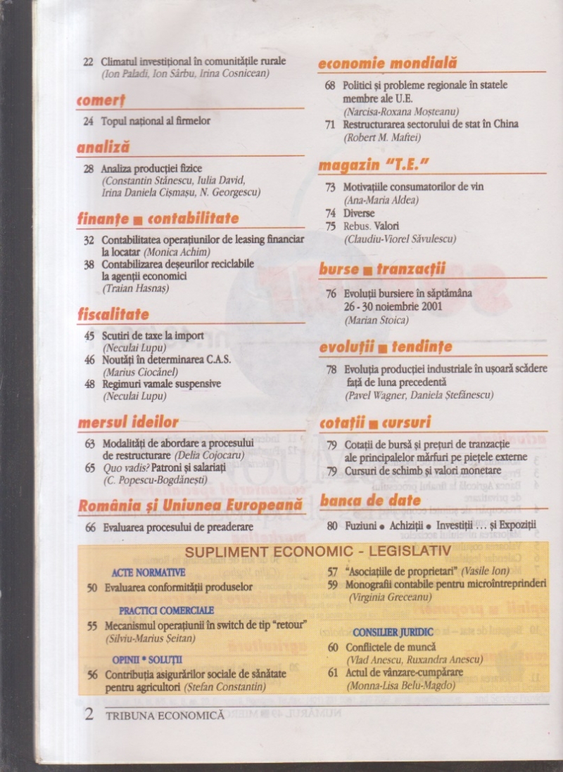 Comandă online cartea "Tribuna Economica, Nr. 49/2001" la 6,20 lei Cristian Gorie, tiparită la editura Tribuna Economica în anul 2001 cu un număr de 80 pagini. Livrare din stoc cu plata ramburs sau online cu cardul.