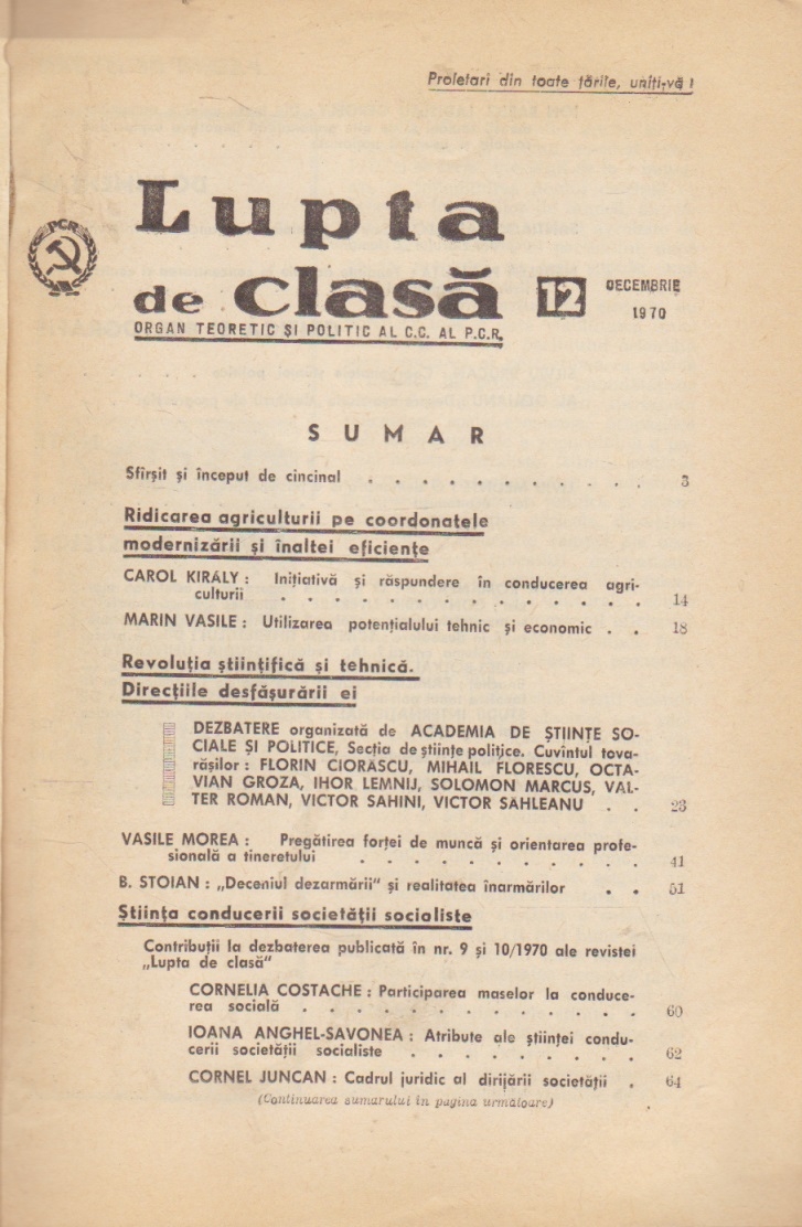 Comandă online cartea "Lupta de Clasa - Organ Teoretic si Politic al Comitetului Central al Partidului Comunist Roman, Decembrie 1970" la 6,20 lei în anul 1970 cu un număr de 128 pagini categorie Politica, Reviste / Almanahuri. cu plata ramburs sau online cu cardul. Momentan titlul "Lupta de Clasa - Organ Teoretic si Politic al Comitetului Central al Partidului Comunist Roman, Decembrie 1970" nu este disponibil însa vă puteți înscrie pentru a fi notificat în momenul reaprovizionarii.