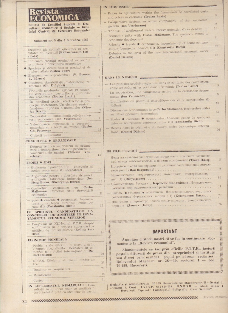 Comandă online cartea "Revista Economica, Nr. 5/1982" la 6,20 lei, tiparită la editura Revista Economica în anul 1982 cu un număr de 32 pagini de anticariat (foarte buna). Livrare din stoc cu plata ramburs sau online cu cardul.